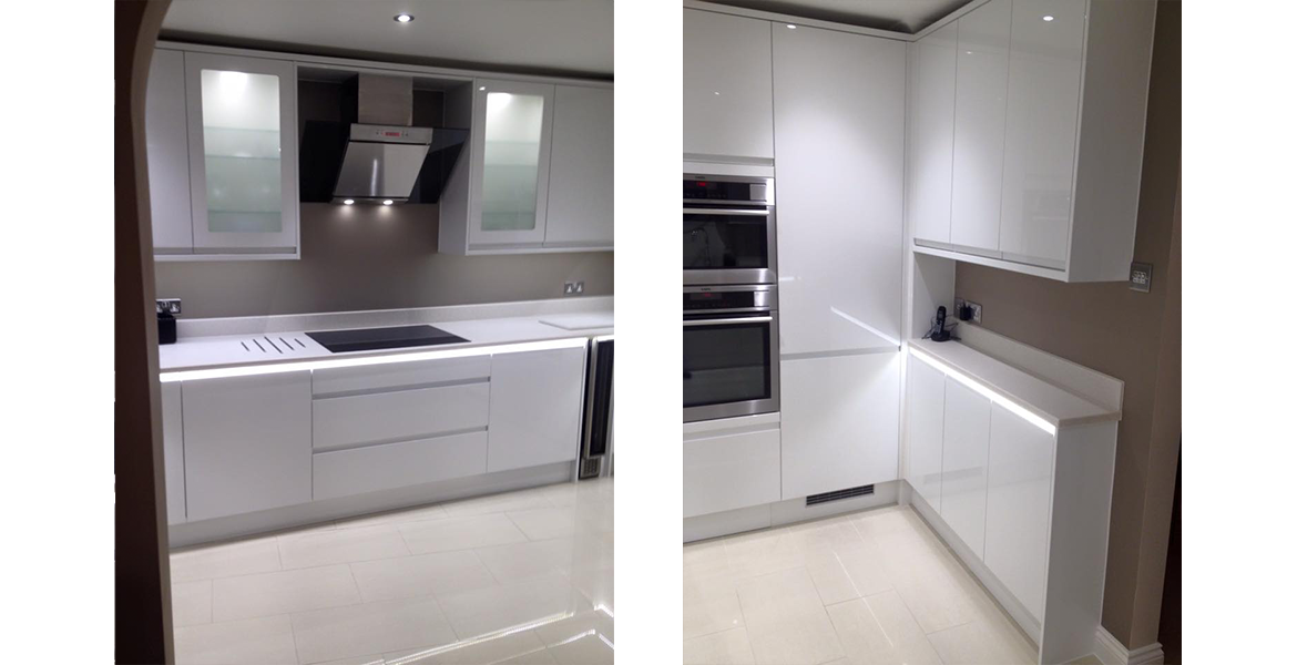 In order to brighten the kitchen, our first step was choosing a light colour to give the impression of space. We paired the light walls with white gloss finish integrated cupboard doors to complete the clean, modern visual the client desired.