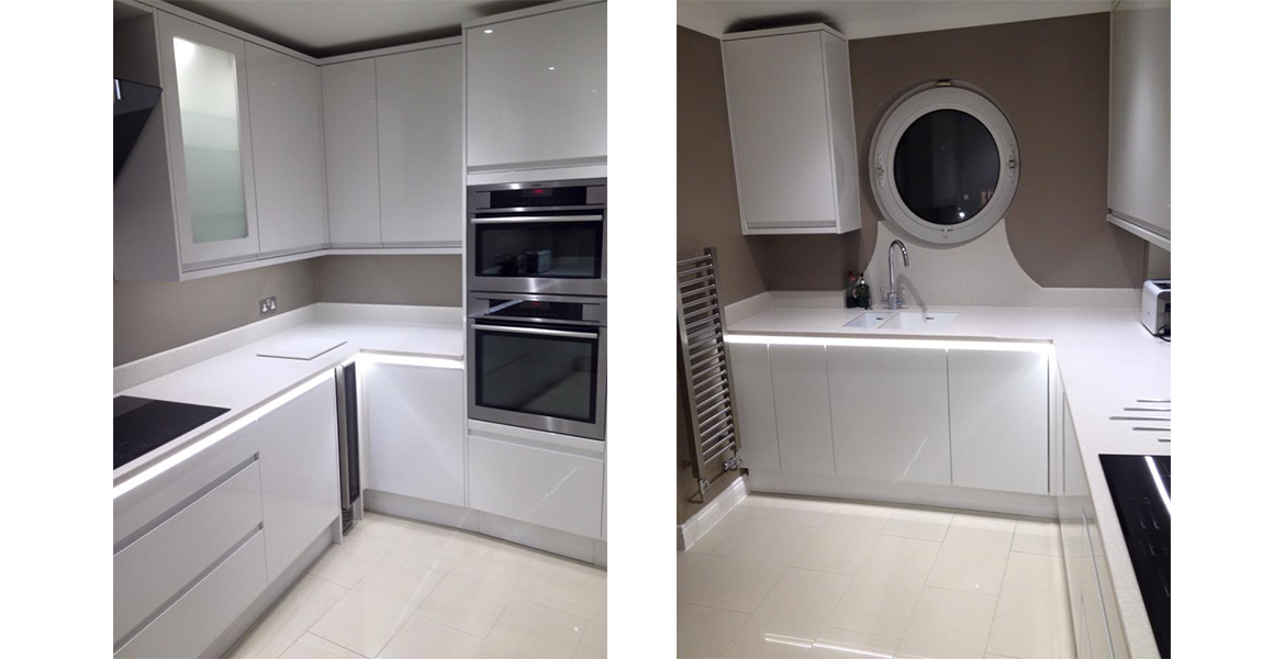 Finally, we added an upstand along the entire kitchen wall, curving around the existing round window - this provided protection to the wall, as well as becoming a feature of the room. As a finishing touch, our team installed hob bars beside the hob, to allow hot pans to be place down on the worktop without the risk of damage from burning.